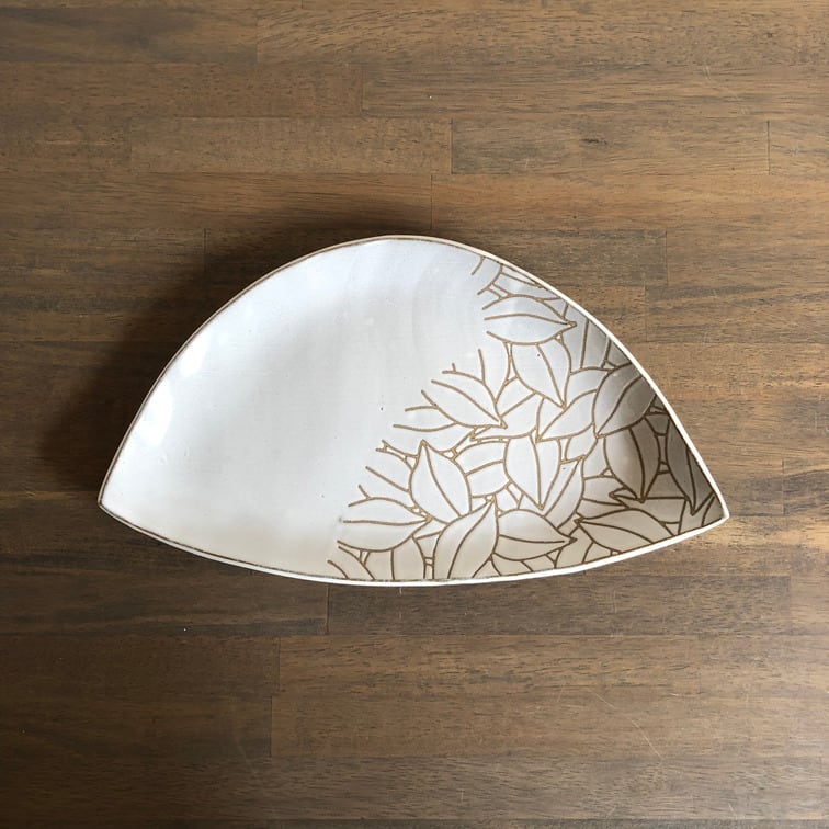 新感覚上野焼の伝統技術とモダンデザインが融合した半円皿054。食卓を彩るアイテム、白い釉薬の一部に映える葉紋が印象的。全体のクリーム色が演出する清潔感もグッド!
