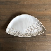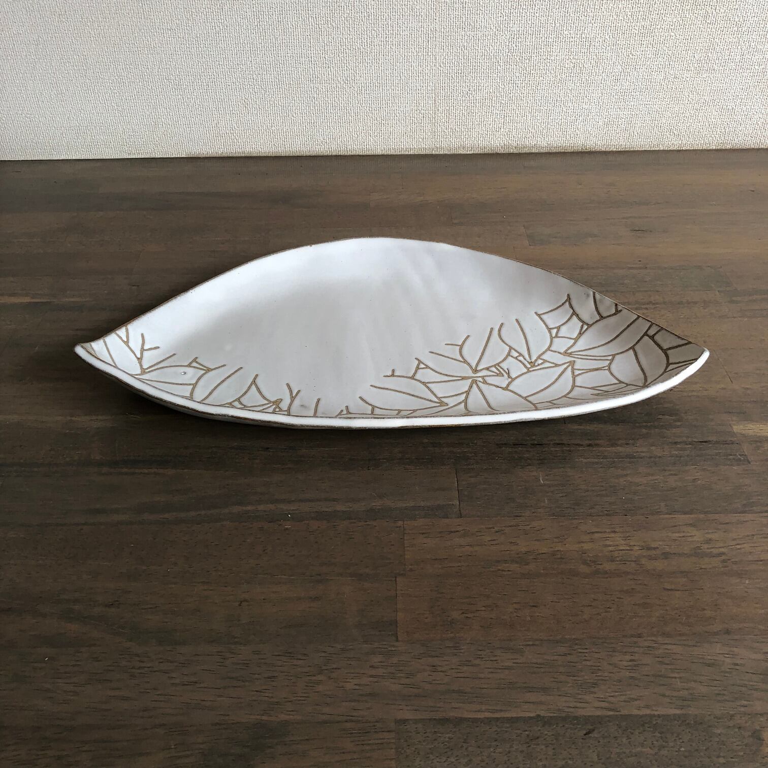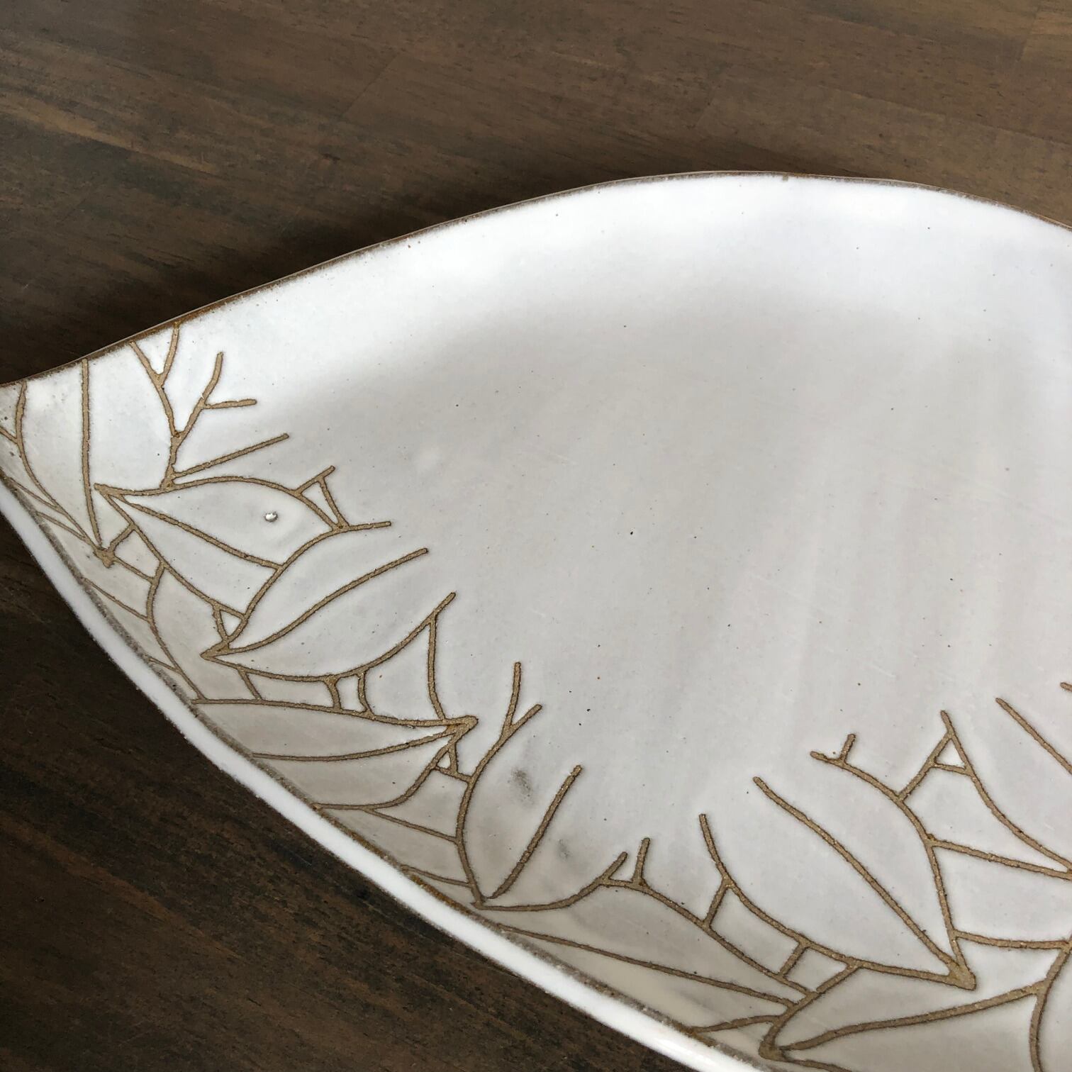 (説 明)シンプルな白の釉薬が美しく彩られ、一部に生き生きとした葉が施された一品