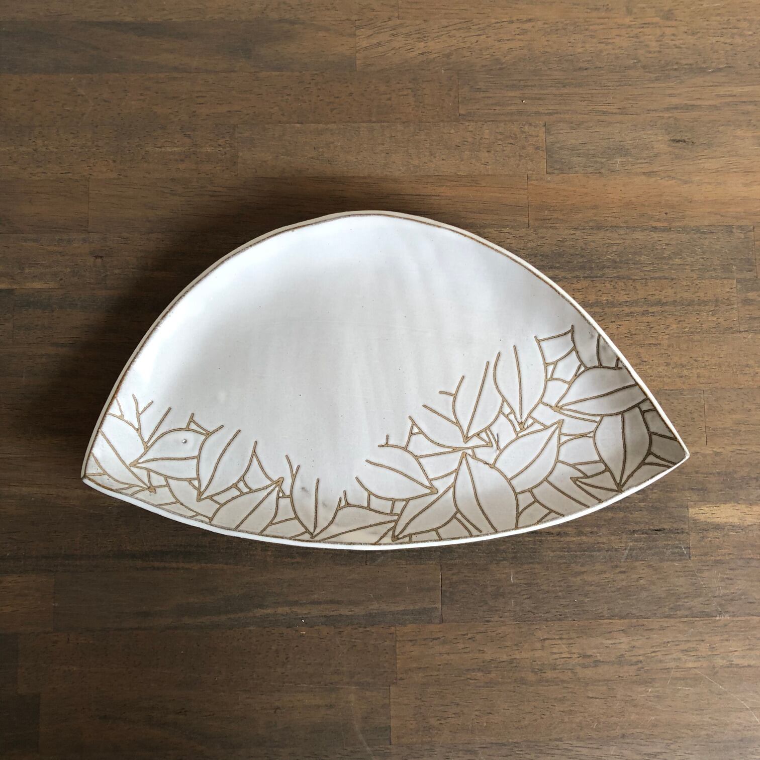 新感覚上野焼の伝統技術とモダンデザインが融合した半円皿055。食卓を彩るアイテム、白い釉薬の一部に映える葉紋が印象的。全体のクリーム色が演出する清潔感もグッド!