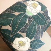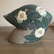 (説 明)明るい青緑色の顔料を施した一面に塗布し、一部に椿の花を紋様とした一品。