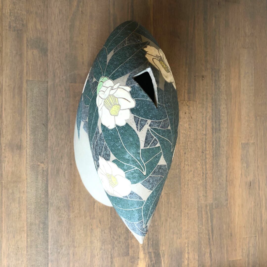 頂部に透かし口があり、使い方の一つとしてアロマオイルのポットのように活用しても魅力的です。お好きな香りを椿紋が引き立てます。
