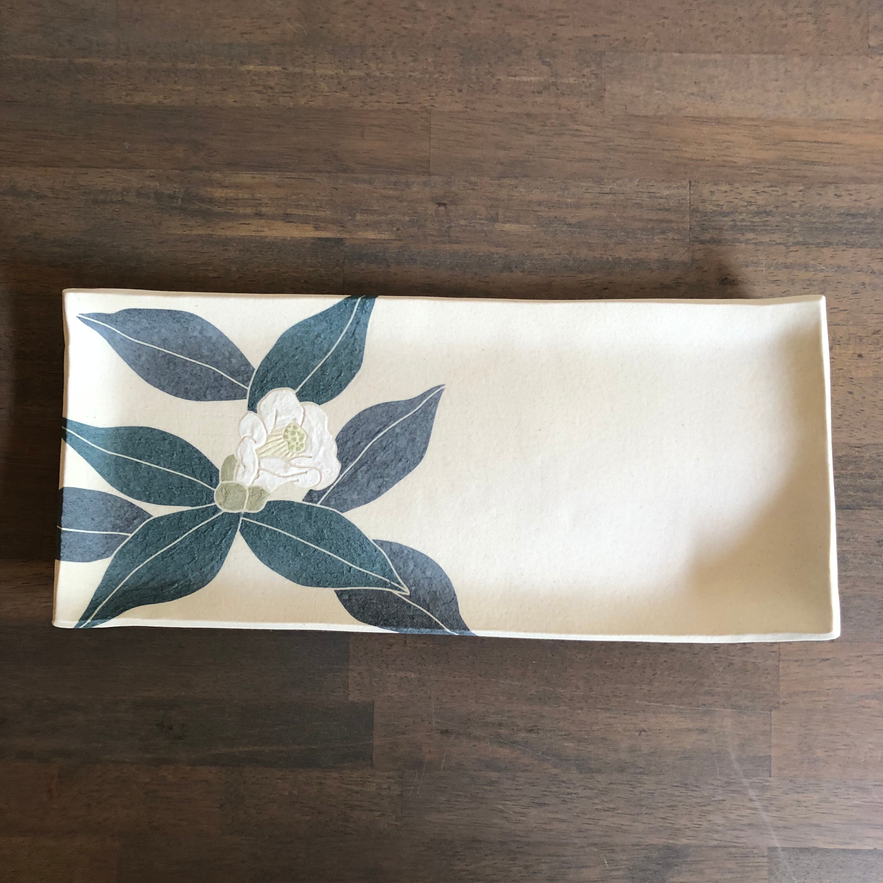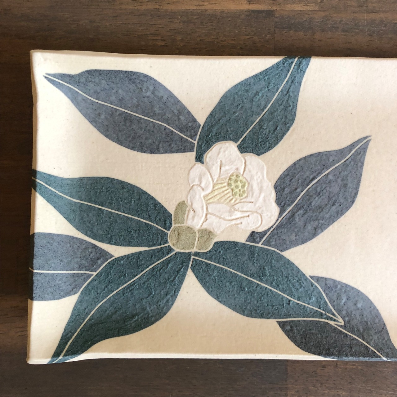 新感覚上野焼の伝統技術とモダンデザインが融合した角皿(大)。食卓を彩るアイテム、白の椿が印象的。