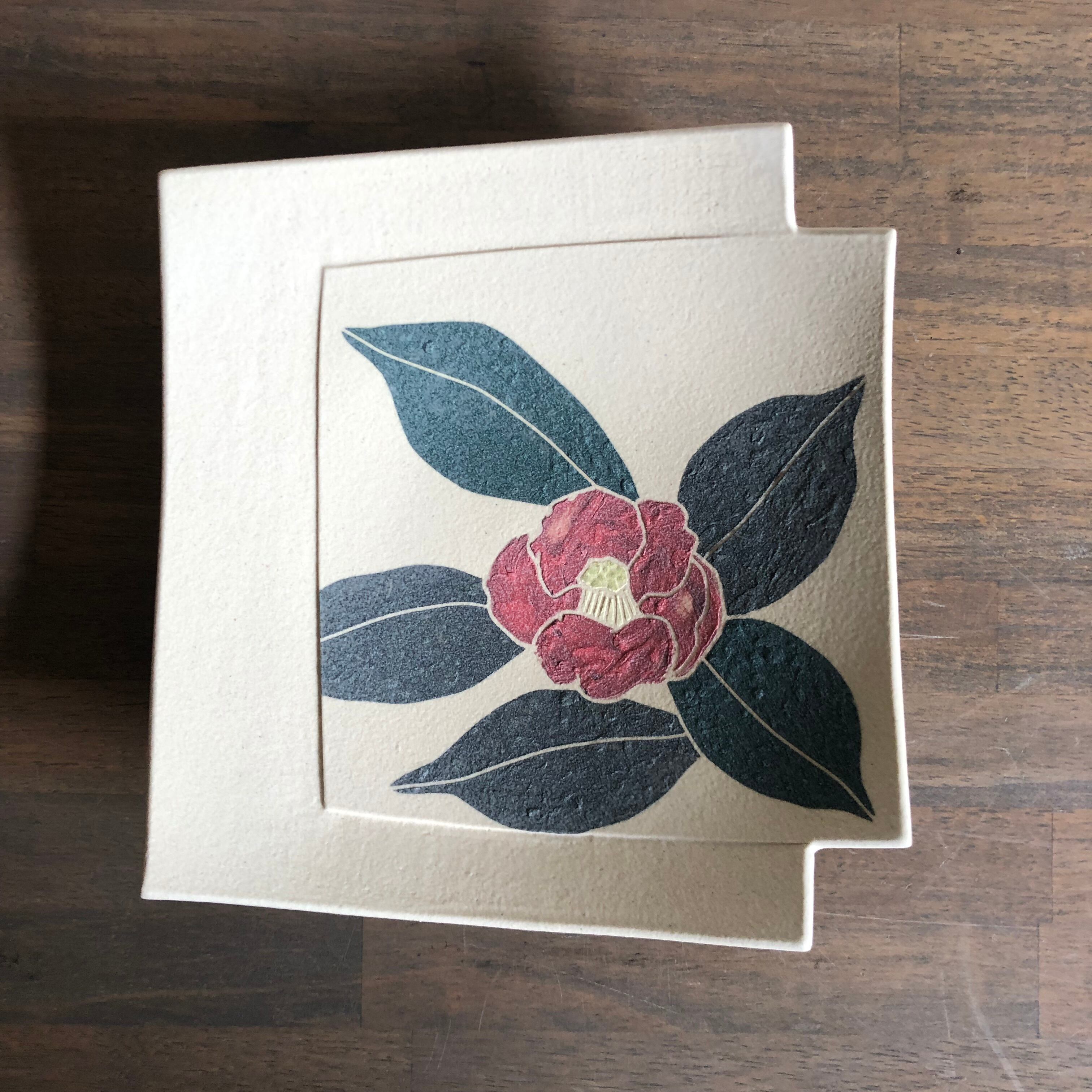 新感覚上野焼の伝統技術とモダンデザインが融合した角皿(四角)。食卓を彩るアイテム、赤の椿が印象的。