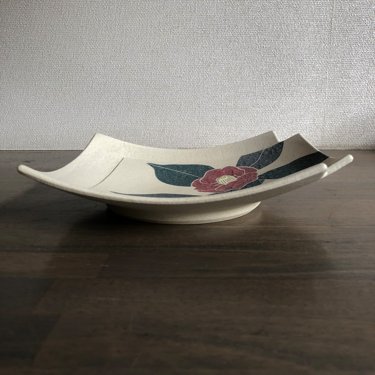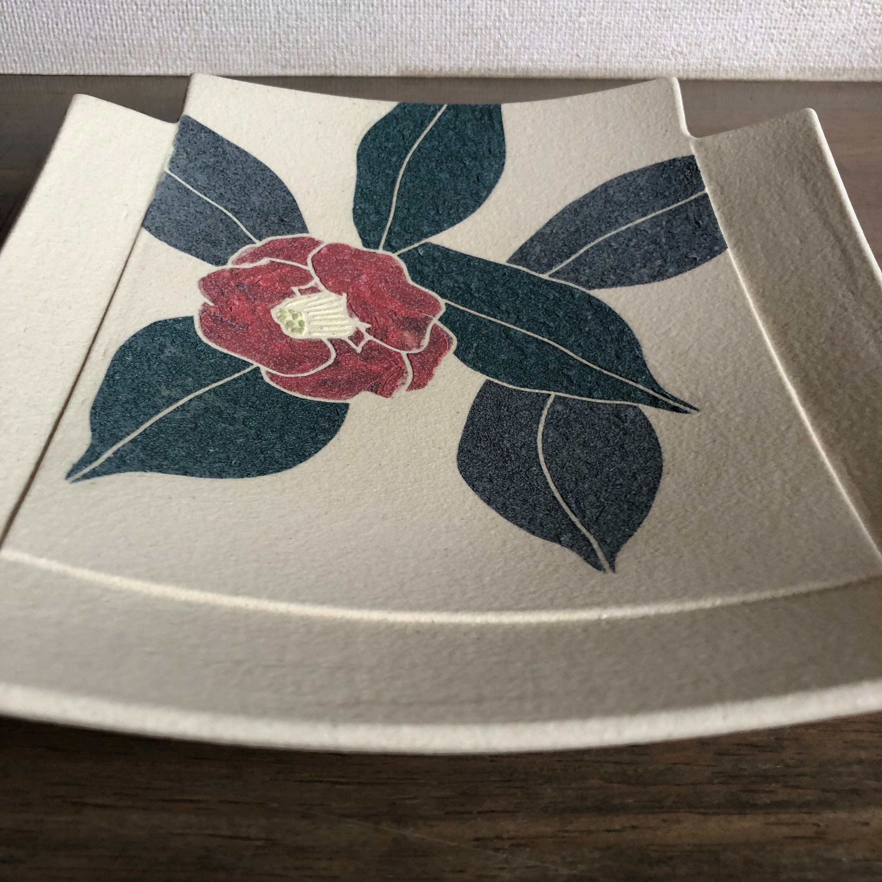 新感覚上野焼の伝統技術とモダンデザインが融合した角皿(四角)。食卓を彩るアイテム、赤の椿が印象的。