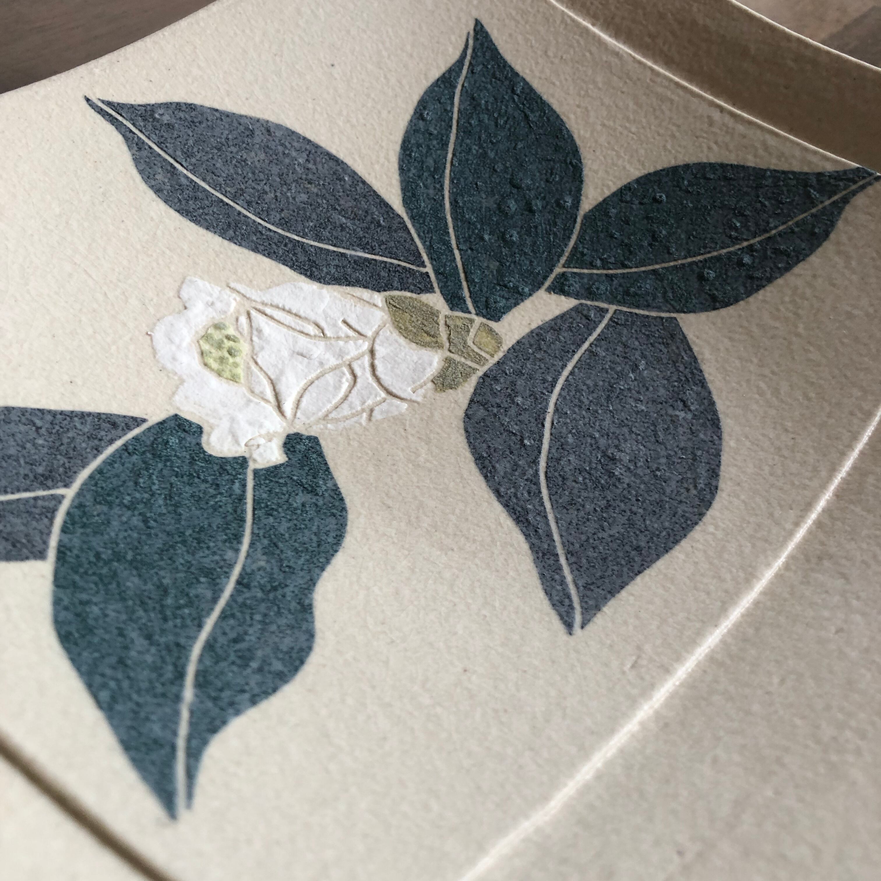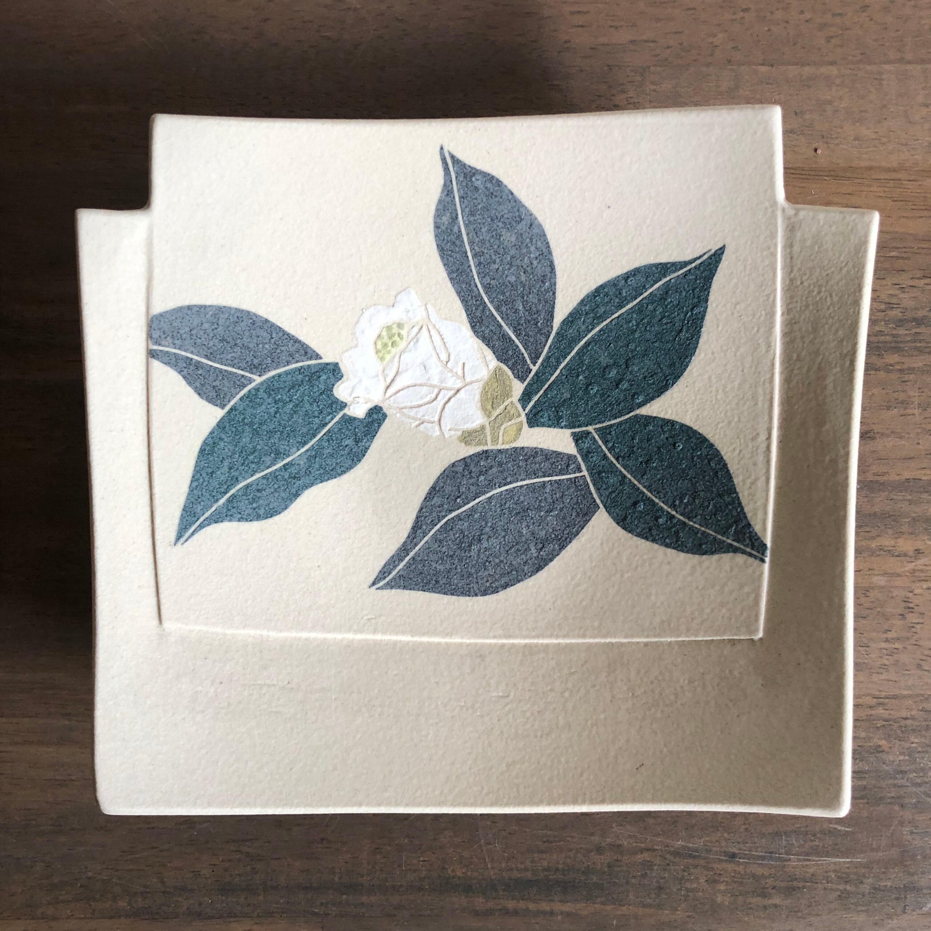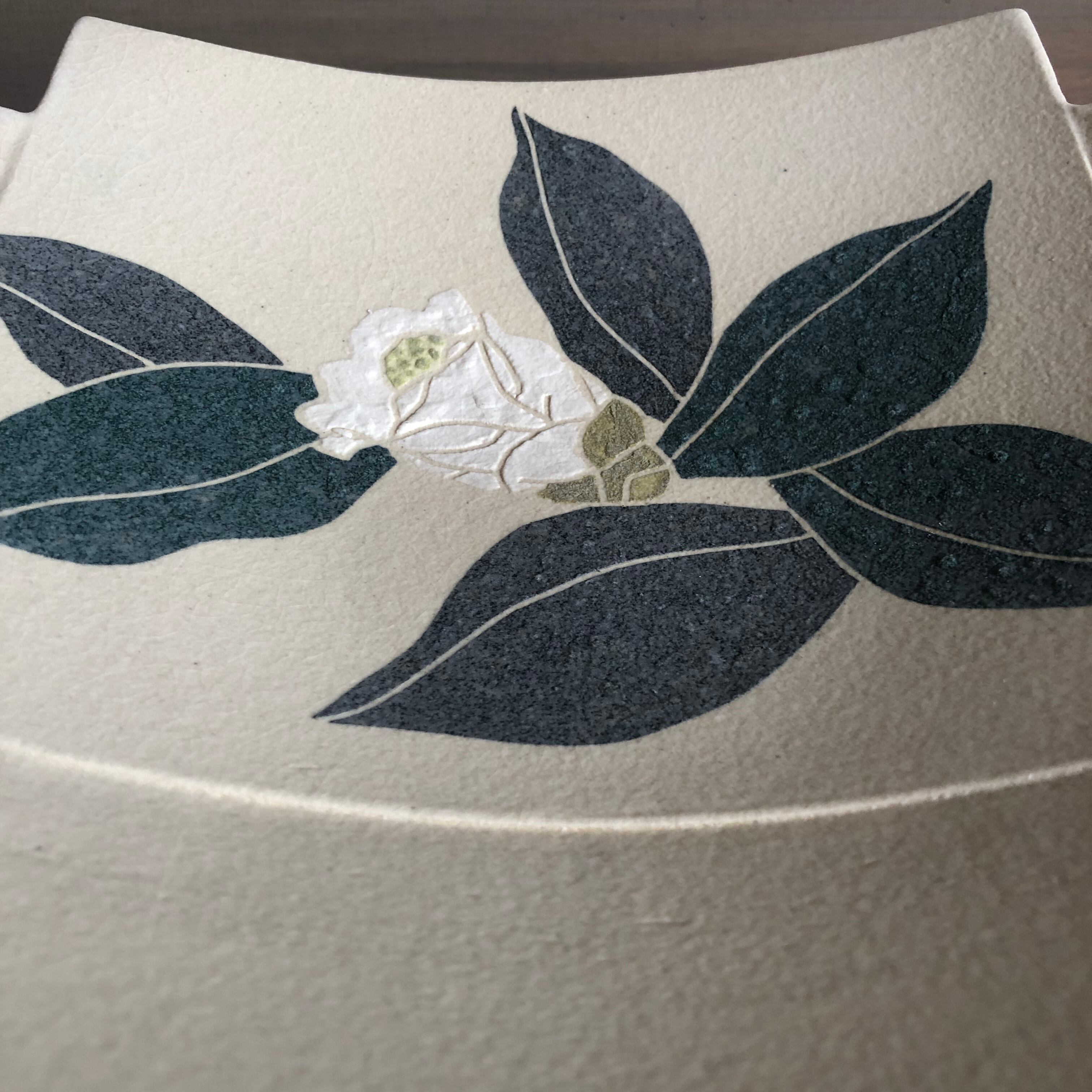 新感覚上野焼の伝統技術とモダンデザインが融合した角皿(四角)。食卓を彩るアイテム、白の椿が印象的。