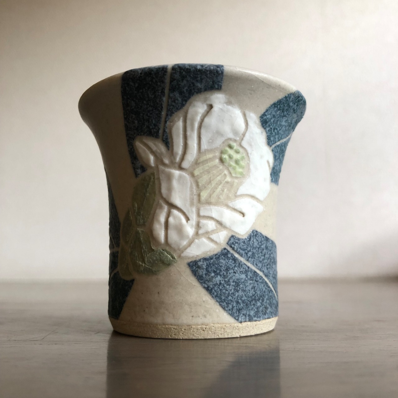 (技 法)マスキング技法によって彩られた「椿紋」シリーズの一つ たたら成形による自然な風合いの器形