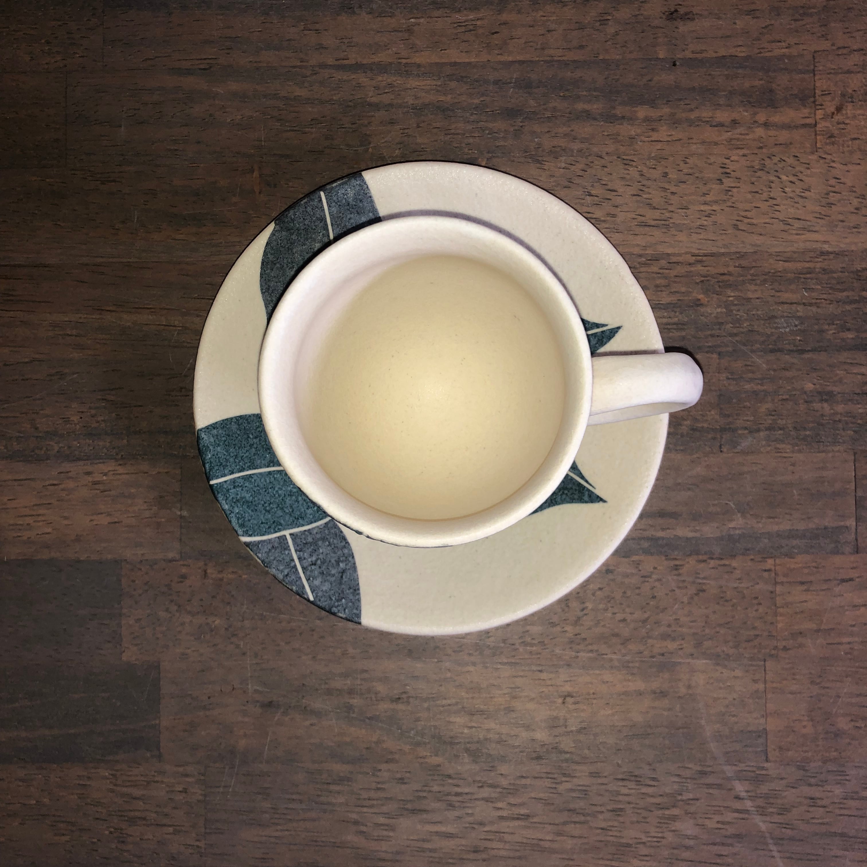 (説 明)ソーサーとのセットで一部に深緑色の釉薬を施釉した一品。